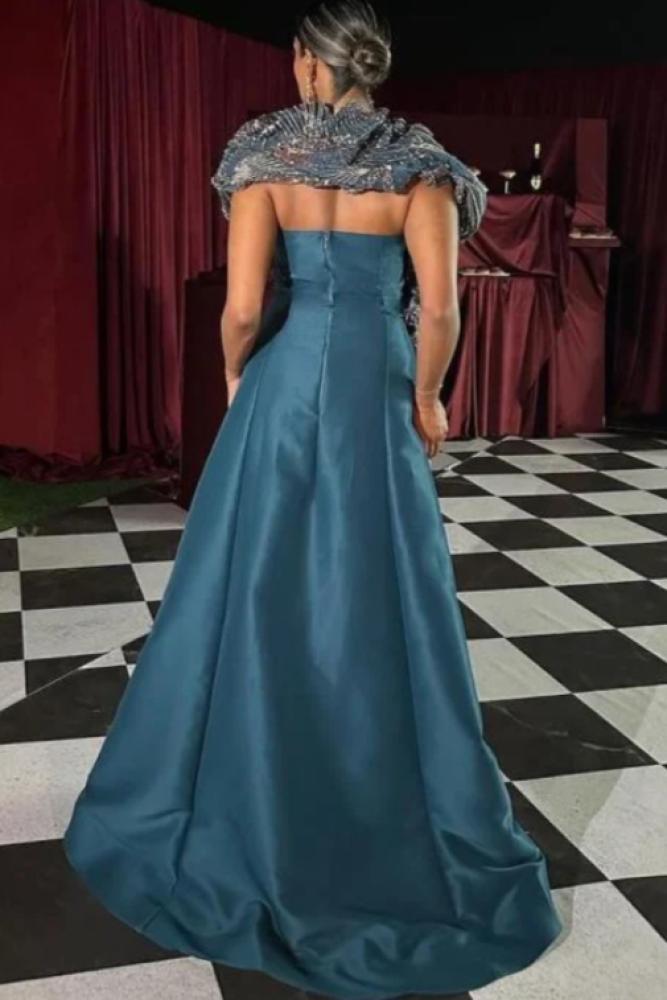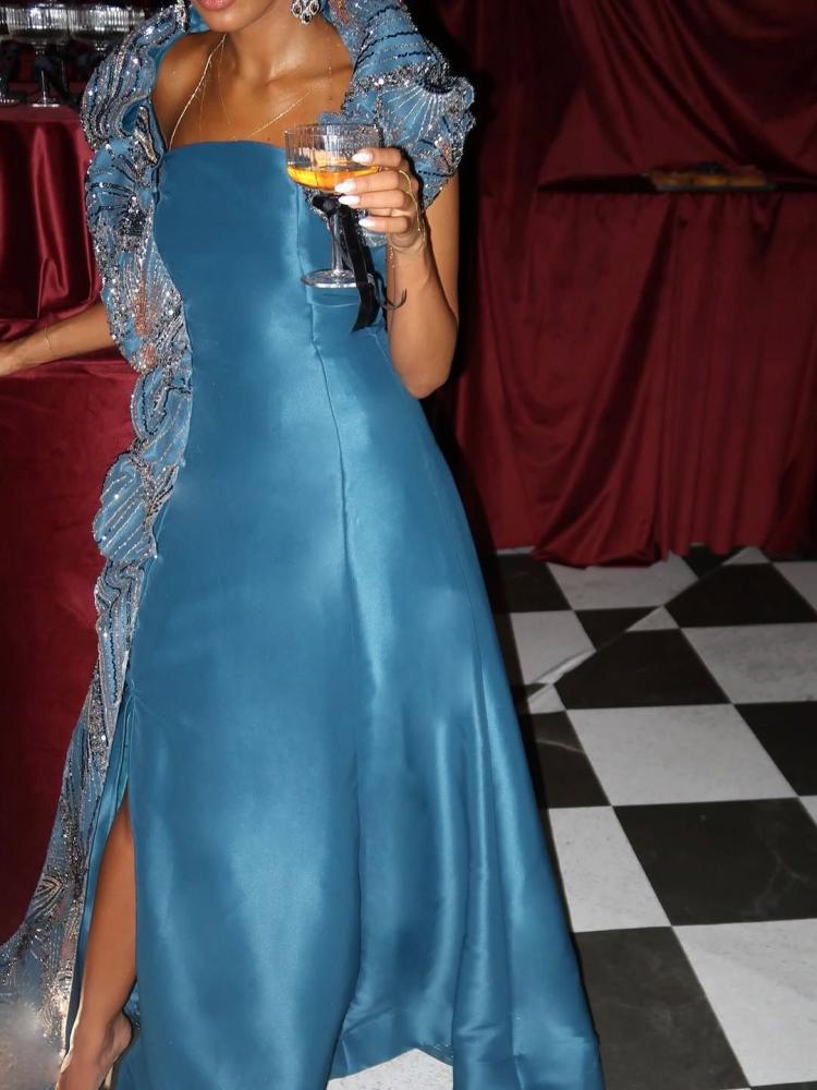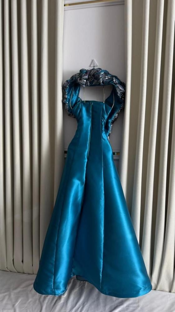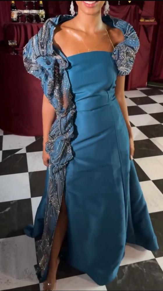 فستان أزرق فخم يجمع بين الفخامة والأنوثة في تصميم استثنائي يأسر الأنظار منذ اللحظة الأولى ، يأتي الفستان بتصميم انسيابي مع شق جانبي جريء يبرز جمال القوام ويمنحك إطلالة راقية تلفت الانتباه ، يتميز بتوب سترابلس (بحمالات مخفية) بتصميم بسيط وراقي يبرز الأكتاف بأسلوب أنثوي ناعم ، أما القطعة الأبرز فهي الوشاح المطرز بالكامل بالترتر والكشكشة البراقة، الذي ينسدل بفخامة ليمنح الإطلالة بعدًا ملوكيًا يليق لسهراتك الفاخرة.