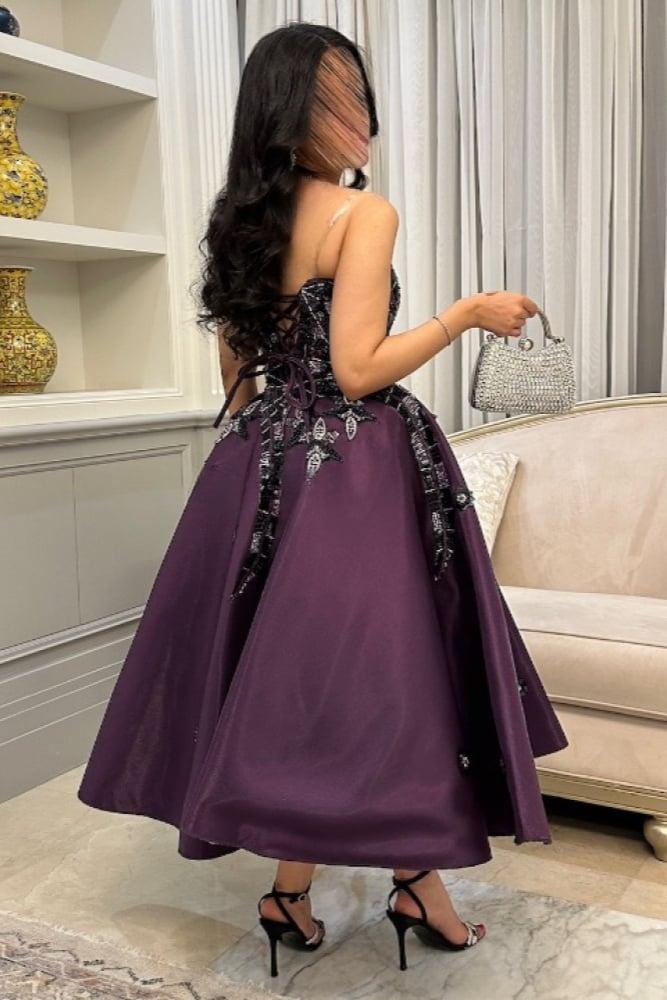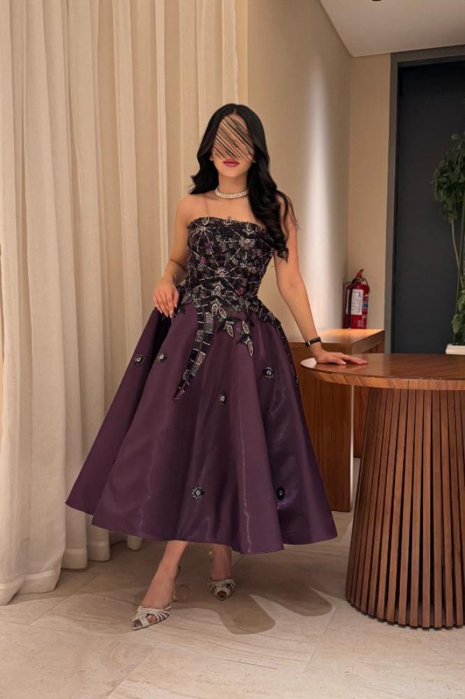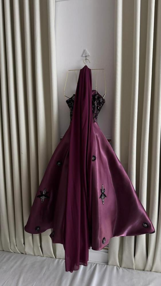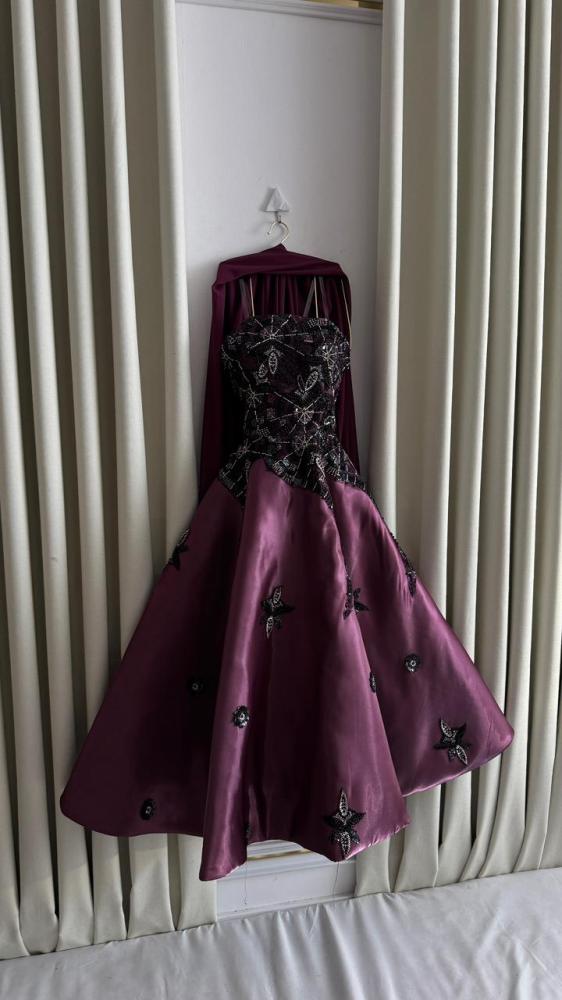 •  بنفسجي داكن مع تطريزات متعددة الألوان في الجزء العلوي تضيف لمسة من البريق والحيوية على التصميم.