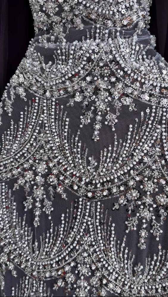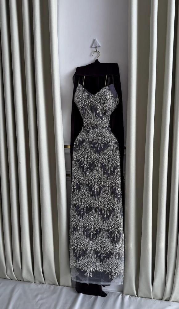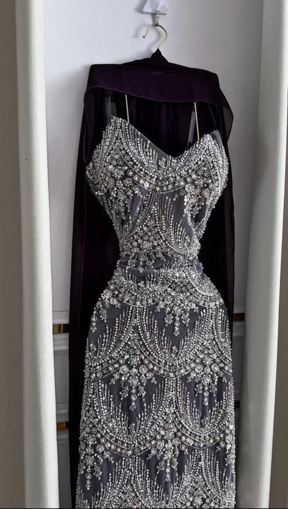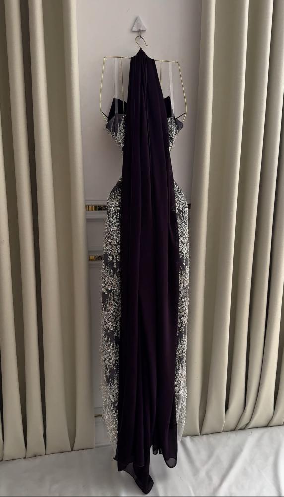 فستان انيق يتميز بتصميمه المبهر والابداع مطرز بخرز وبطانه باربي ناعم وشال شيفون راقي